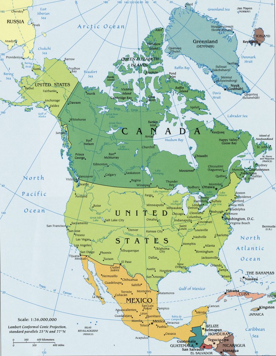 Крупнейшая страна – это, конечно, США. Более 300 миллионов человек, 9.5 млн. квадратных километров площади, крупнейшие промышленные и торговые центры во всем мире позволяют США уверенно представлять Северную Америку на карте.