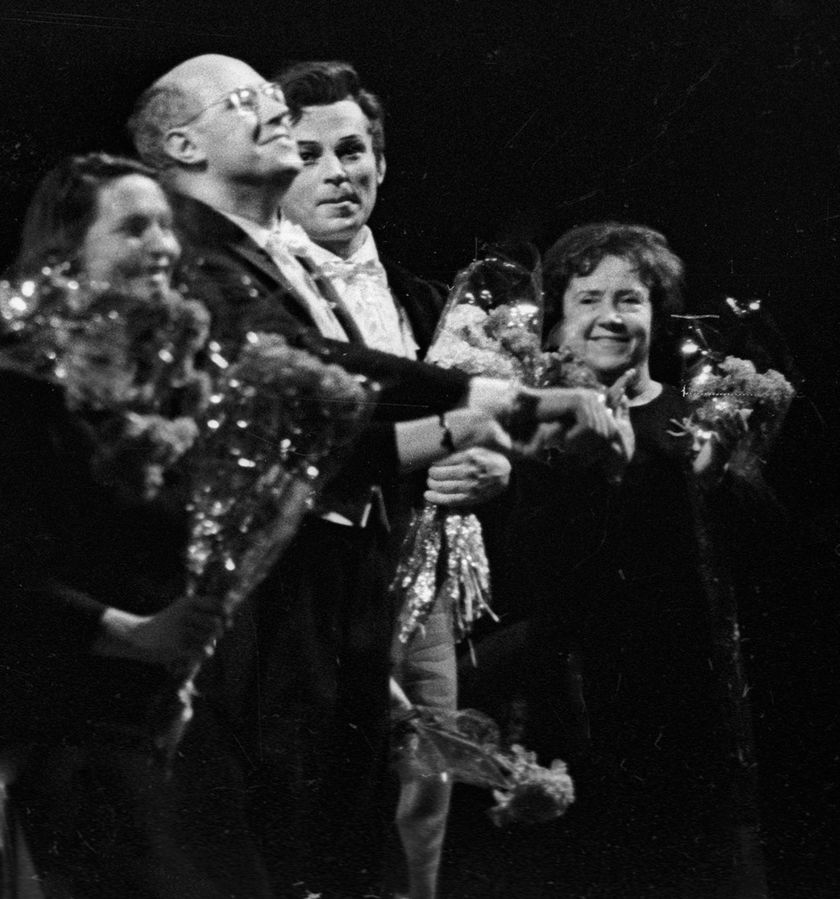 (Известный советский виолончелист Мстислав Ростропович в окружении артистов после удачного дебюта в качестве дирижера новой постановки оперы П. И. Чайковского "Евгений Онегин" на сцене Большого Театра, СССР. Фото: А. Коньков, 1 января 1968)