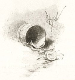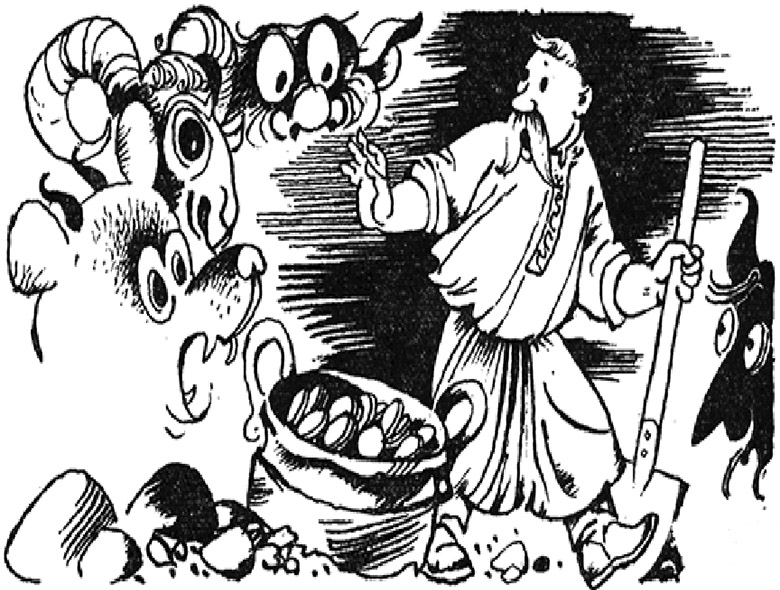 И тут началась настоящая чертовщина. Не успел дед достать табаку, чтобы понюхать, как кто-то чихнул у него за ухом. Начал копать и откопал котелок. «А, голубчик, вот где ты!». И следом за ним эти же слова повторили птица, баранья голова с верхушки дерева и медведь. Дед перепугался, схватил котёл и кинулся бежать. В это время его стали искать мать и дети. Поужинав, мать вышла вылить горячие помои и увидела, что на неё ползёт бочка. Решив, что это шалящие дети, женщина вылила на неё помои. А оказалось, это шёл дед.