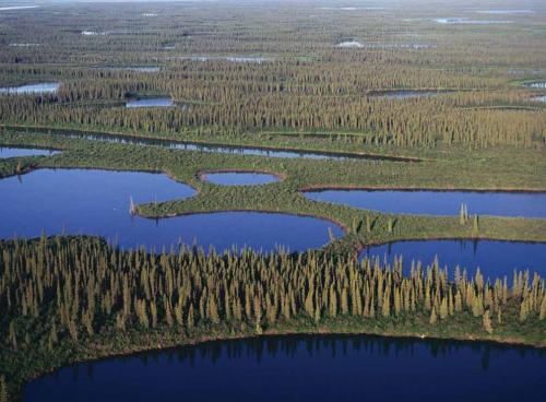 Для тайги Западной Сибири характерны темнохвойные зоны с разнообразием кедра, северной ели и пихты. Изредка можно встретить сосновые леса, занимающие участки между болотами. Большинство низинного ландшафта занимают бескрайние болота. Так или иначе, вся Западная Сибирь характеризуется заболоченностью, но есть здесь и уникальный природный массив - самое крупное болото в мире, Васюганское. Оно заняло большие территории в южной тайге.