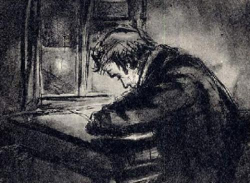 (Макар Девушкин читает повесть Гоголя "Шинель" . Иллюстрация Н. Верещагин)