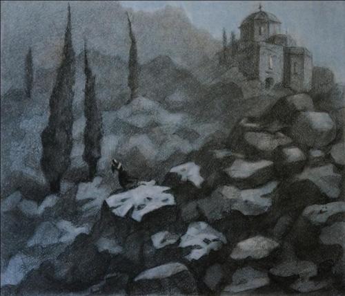 (Иллюстрация Л. О. Пастернака к поэме М. Ю. Лермонтова «Мцыри». Чёрная акварель. 1891 г.)