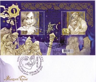 (Две почтовые марки Украины к "200-летию со дня рождения Н. В. Гоголя" и "Ночь перед Рождеством", выпуск 2009 года)