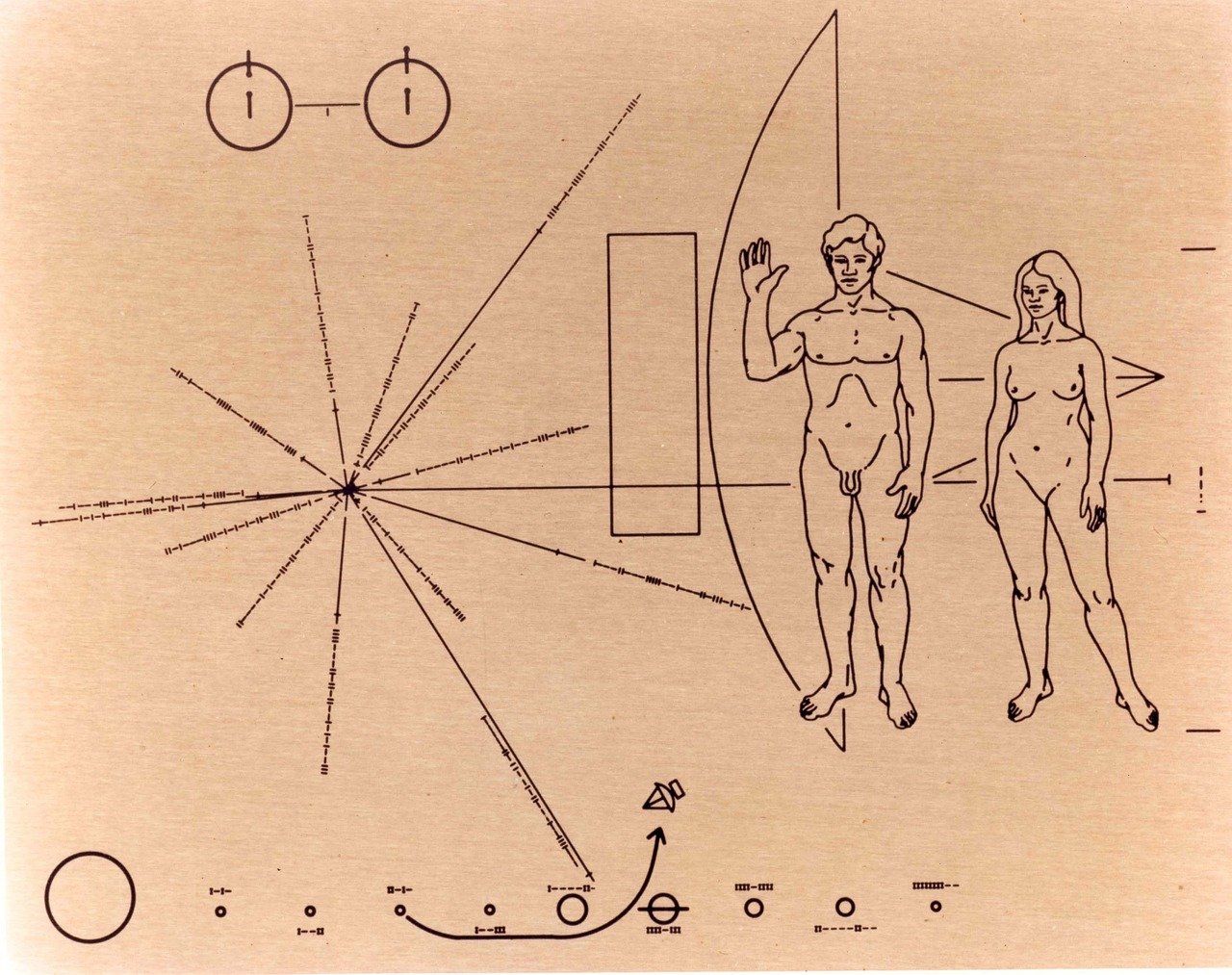 В том случае если межпланетную космическую станцию Пионер 10 обнаружит внеземная цивилизация, на корпусе аппарата расположили небольшую подсказку. Это табличка, выполненная из золота, на которой были нанесены символьные обозначения самого аппарата Пионер 10, у которого стоят мужчина и женщина (нагие), а также наша галактика со схематическим обозначением в ней Солнца и планеты Земля.