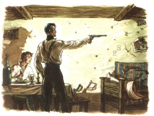 Главный герой повести личность, конечно, сильная и незаурядная. Но, все его достоинства меркнут на фоне его зависти к более удачливому сопернику. Зависть, как известно мужчину, тем более гусара, никак не красит. Ещё более блекнут его достоинства от мелочной мстительности. Эти качества, тем более усугубляются, когда он доводит до ужаса жену графа, целясь в него. Однако, в последний момент что-то останавливает его от убийства. Думаю, что не столь важна истинная причина, важнее другое, человек не стал убивать другого человека. Вполне возможно, в этот момент в главном герое проснулись истинные человеческие чувства.