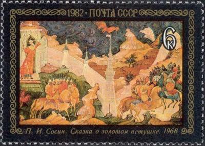 (Почтовая марка П.И. Сосин "Сказка о золотом петушке", 1982 г.)