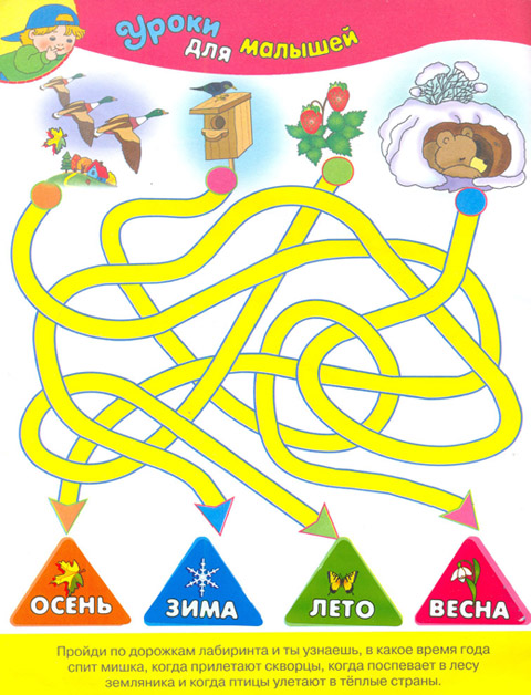 Пройди по дорожкам лабиринта и ты узнаешь, в какое время года спит мишка, когда поспевает в лесу земляника и когда птицы улетают в теплые края.