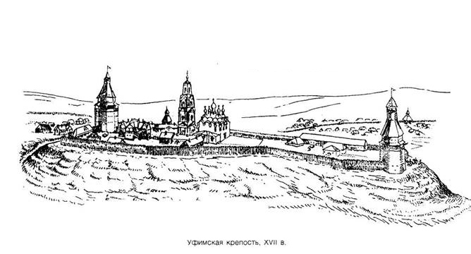 До того момента когда русские пришли на эту землю, по преданиям башкирского народа на месте города Уфы раньше был большой город, простиравшийся больше чем на 10 верст по берегам рек Белая и Уфа, здесь была резиденция башкирского наместника правителя Ногайской Орды. После присоединения европейской части Башкортостана к Московскому царству в 1557 году башкиры обратились с просьбой к царю построить на их территории город, для того чтобы поближе возить дань, а также для защиты и удобства их проживания. В 1574 году стрельцами во главе с воеводой Иваном Нагим была построена Уфимская крепость или острог, которая к 1586 году становится городом и административным центром Уфимского уезда во главе с воеводой. К середине 17 века население города, включая солдат гарнизона (200-300 человек), насчитывало около полторы тысячи человек. История Уфы той эпохи тесно связана с событиями Крестьянской войны (1773-1750 гг.) и в частности Пугачевского восстания 1773, когда осенью город был осажден повстанцами и практически отрезан от внешнего мира и был освобожден только в следующем году весной регулярными войсками под командованием подполковника Михельсона.