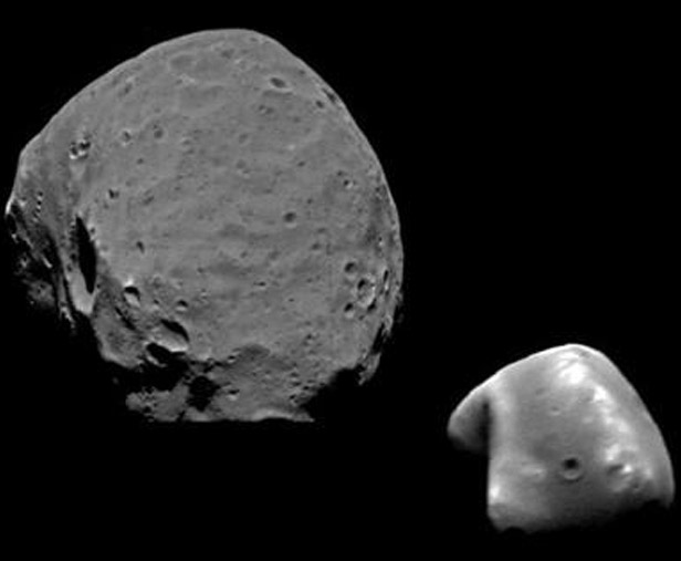 Марс имеет 2 естественных спутника вращающихся вокруг планеты. Это Фобос и Деймос. Интересно, что на греческом языке их названия переводятся, как "страх" и "ужас". И это не удивительно, ведь внешне оба спутника, действительно, внушают страх и ужас. Их формы настолько неправильны, что скорее похожи на астероиды, при этом диаметры совсем небольшие - Фобос 27 км, Деймос 15 км. Состоят спутники из каменистых пород, поверхность в множестве небольших кратеров, только у Фобоса есть огромный кратер диаметром в 10 км, почти в 1/3 от размера самого спутника. Видимо в далеком прошлом некий астероид едва не уничтожил его. Спутники красной планеты настолько напоминают по форме и строению астероиды, что по одной из версий Марс сам когда-то захватил, подчинив себе и превратив в вечных своих слуг.