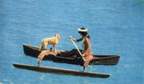 (Гавайцы даже отправляясь в лодке не забывают украсить себя и даже свою собаку национальными венками)