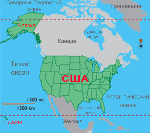 Западные территории Америки омываются Тихим океаном, восточные - Атлантическим. К юго-востоку атлантический бассейн переходит в Мексиканский залив. Северная часть полуострова Аляска омывается водами Северного Атлантического океана. По морю границы США с другими государствами проходят по восточному и западному побережьям.