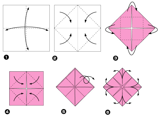 2. Пригните все уголки к центру листа, направляя их вперед и складывая по пунктирным линиям.
