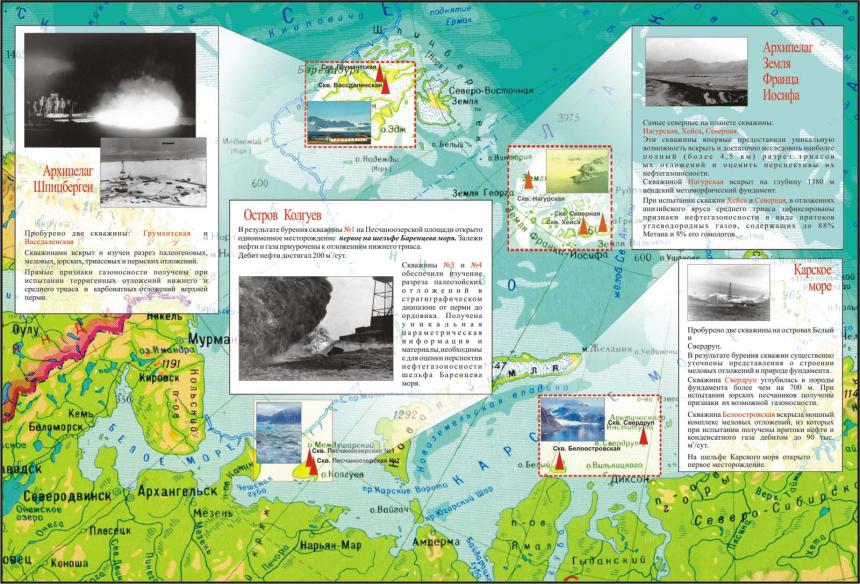 Баренцево море: 11 месторождений газа и нефти. Одно из них — Штокмановское относится к категории уникальных (4000 млрд. кубометров газа). Еще 7 считаются крупными, 2 — средних и 1 мелкое.