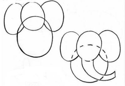 1. Нарисуйте большой овал. Это будет туловище слона. Затем сверху пририсуйте овал поменьше. Это будет его голова и по бокам верхнего овала два овала - уши слона.