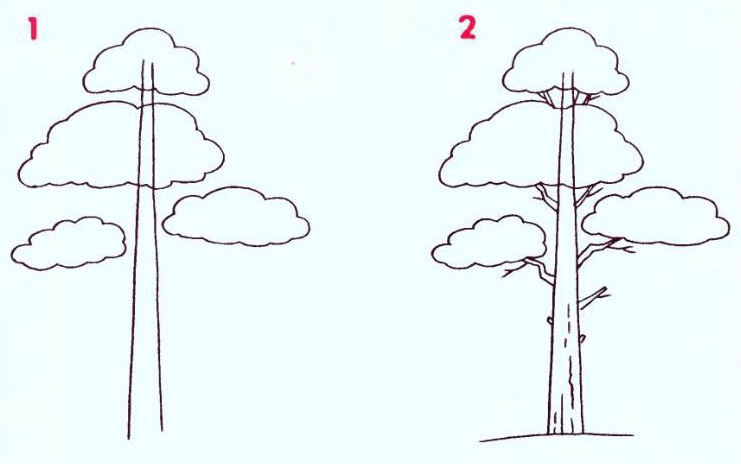 Сосна - высокое дерево с прямым тонким стволом. За счет гибких качеств соснового дерева, раньше ее использовали в строительстве кораблей, делая из сосны мачты. Нарисовать сосну карандашом совсем просто, если следовать несложным инструкциям на схеме-картинке.