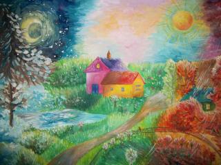 Георгий Скребицкий "Четыре художника". Сошлись как-то вместе четыре волшебника-живописца: Зима, Весна, Лето и Осень; сошлись да и заспорили: кто из них лучше рисует? Спорили-спорили и порешили в судьи выбрать Красное Солнышко: «Оно высоко в небе живёт, много чудесного на своём веку повидало, пусть и рассудит нас».