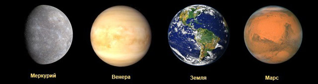Планеты земной группы: Меркурий, Венера, Земля и Марс. Эти планеты небольшого размера с каменистой поверхностью, они находятся ближе других к Солнцу.