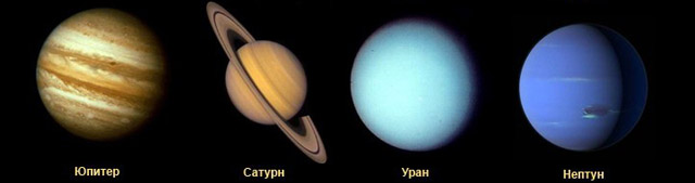 Планеты гиганты: Юпитер, Сатурн, Уран и Нептун. Это крупные планеты, состоящие в основном из газа и им характерно наличие колец, состоящих из ледяной пыли и множества скалистых кусков.