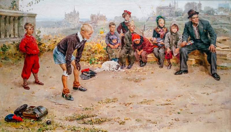Одно из самых популярных произведений художника Сергея Григорьева - картина "Вратарь", которая сейчас находится в Третьяковской галерее. Она написана в 1949 году, после Великой Отечественной войны прошло всего четыре года. Страна к этому времени еще не восстановилась из разрухи, уровень жизни большинства людей был невысокий, но мирная жизнь была наполнена надеждой, оптимизмом. Об этом рассказывает нам картина "Вратарь". Она посвящена увлечению детей футболом, но одновременно передает атмосферу того времени, трудного и вместе с тем счастливого.