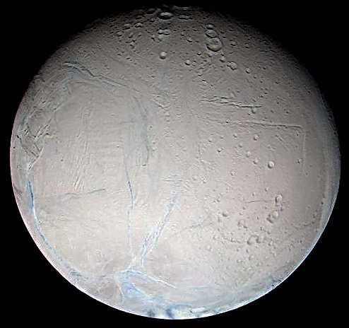 Энцелад интересен тем, что его ледяная поверхность нестабильна. Она постоянно меняется в связи со значительными приливными гравитационными воздействиями Сатурна. Очень светлый спутник с альбедо близким к единице.