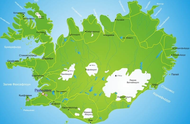 Исландия относится к европейским странам и является островным государством. Располагается она на севере Атлантического океана, состоит из большого одноименного острова и многочисленных мелких островов. Столицей государства является Рейкьявик. Общая площадь Исландии 103 000 км квадратных. Численность населения - 332 500 человек. Местные жители активно мигрируют внутри страны и перебираются из небольших населенных пунктов в города. Из-за этого деревни постепенно пустеют.