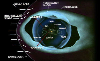 ~2020-30 г. Последняя задача "Вояджеров" - исследование гелиосферы. "Вояджер-2" следом за "Вояджер-1" проходит через границы гелиопаузы и выходит в межзвёздное пространство.На данном расстоянии скорость солнечного ветра резко падает. Эта область называется границей ударной волны. Её достигли и по возможным данным пересекли «Вояджеры». Область ударной волны можно считать границей внутренней гелиосферы. По пока не полностью выясненным данным, гелиосфера здесь заканчивается.