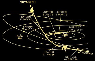 1980 г. "Вояджер-1" пролетая возле Сатурна резко меняет траекторию движения, получает гравитационное ускорение и поднимается над плоскостью Солнечной системы, отправляясь в полет навстречу к межзвездному пространству.